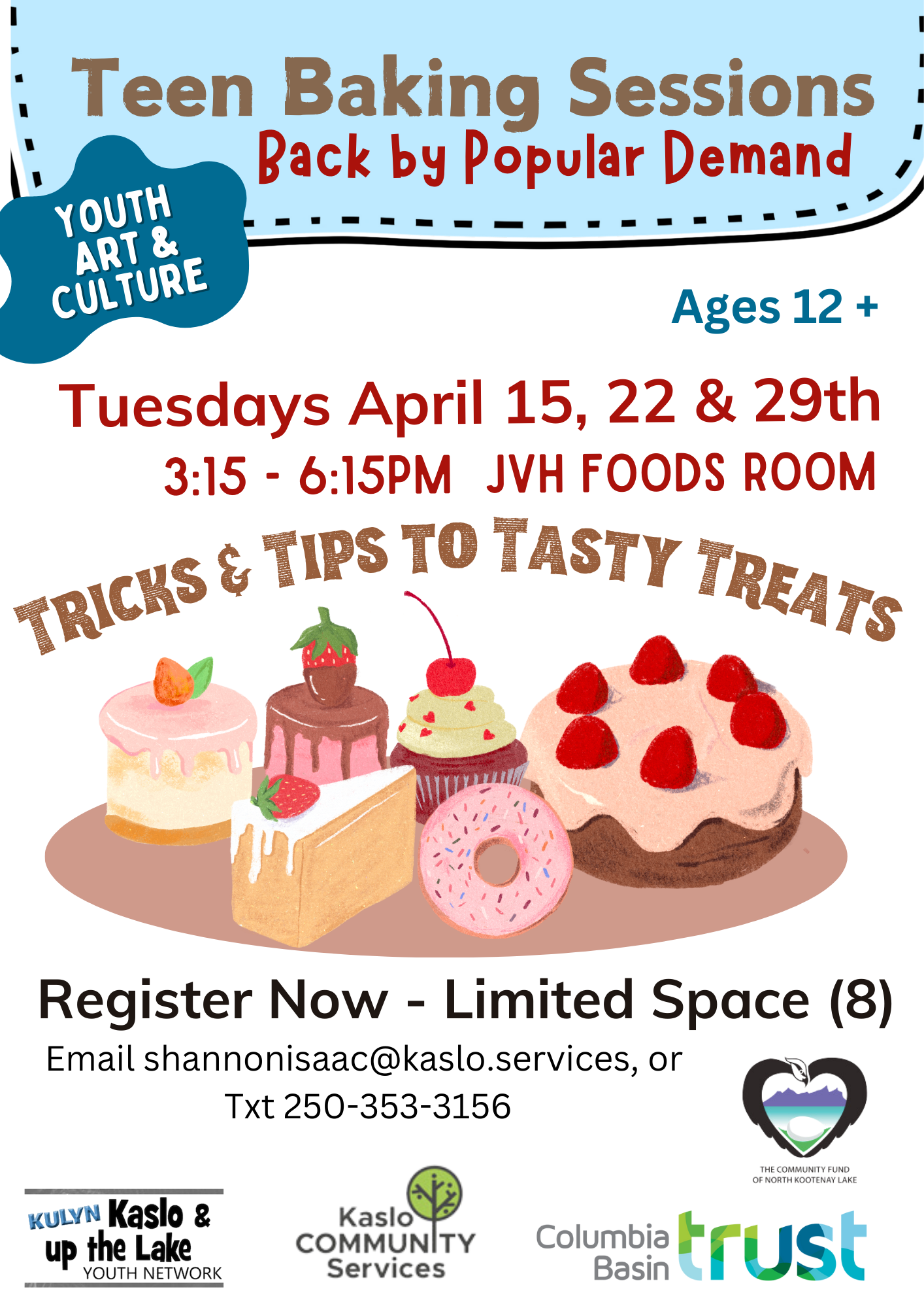 Come join us at the JVH Foods Room on Tuesdays April 15th, 22nd & 29th from 3:15 to 6:15pm for three fun baking sessions with Steph! Learn tips and tricks to make tasty treats that you’ll get to take home with you at the end of each session! We have limited spaces available so register asap. To register email shannonisaac@kaslo.services or text 250-353-3156
