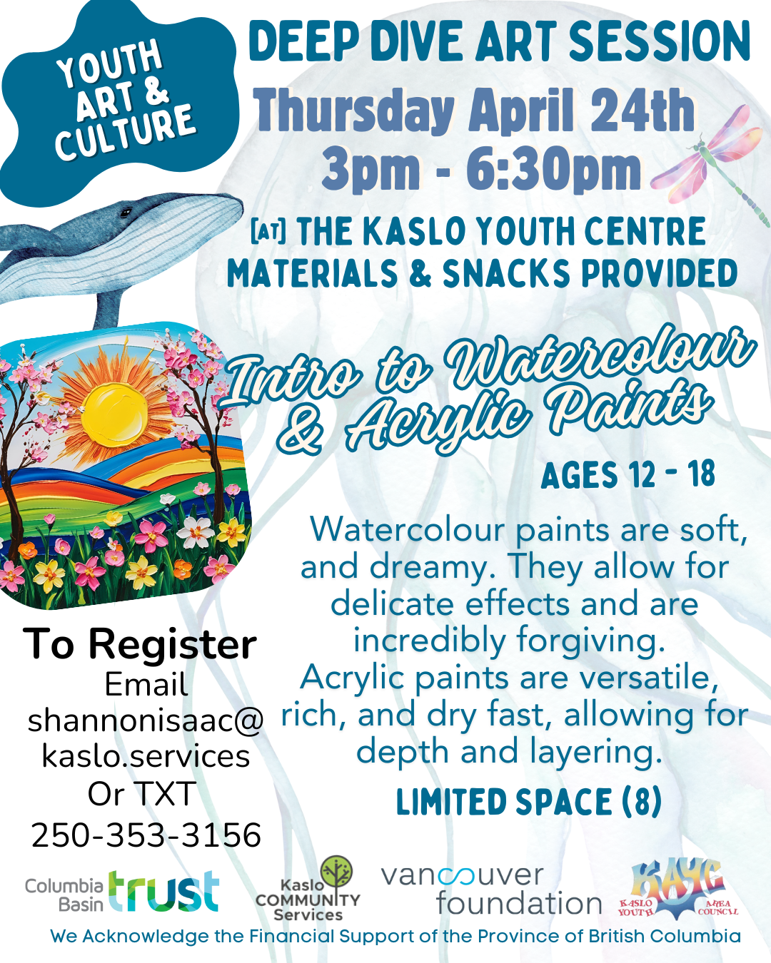 Come join us at the Kaslo Youth Centre with Youth Art & Culture to explore watercolour and acrylic paints! New or experienced, this art session will deepen your knowledge of colour theory and layering! To register email shannonisaac@kaslo.services or text 250-353-3156