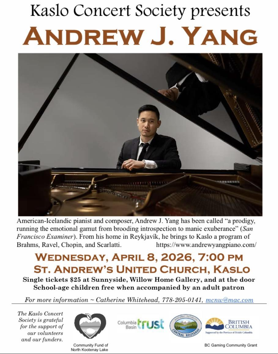 American-Icelandic pianist and composer, Andrew J. Yang has been called "a prodigy, running the emotional gamut from brooding introspection to manic exuberance" (San Francisco Examiner). From his home in Reykjavík, he brings to Kaslo a program of Brahms, Ravel, Chopin, and Scarlatti.